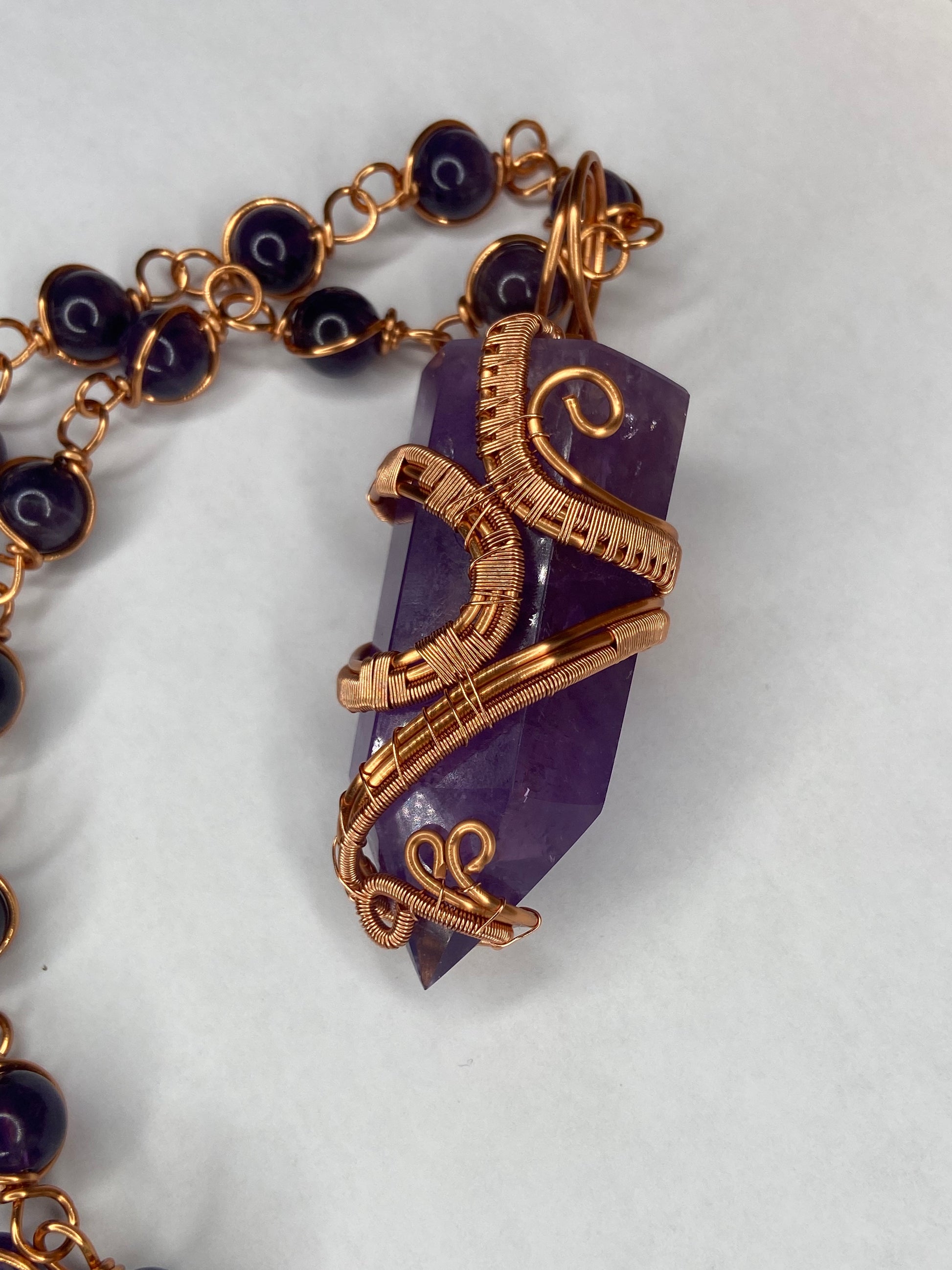 Bathed in the royal glow of deep violet, this Amethyst pendant is a sanctuary you can wear—a calming force that clears the mind, lifts the spirit, and awakens your intuition. Hand-wrapped in radiant copper, the stone’s natural energy flows freely, releasing tension, quieting overthinking, and aligning you with your highest self. Imagine fastening it against your skin: the gentle weight grounding you, the cool smoothness soothing your heart, and a soft, empowering calm settling over your entire being. Each shimmer of purple is a reminder—you are safe, guided, and already more powerful than you realize.