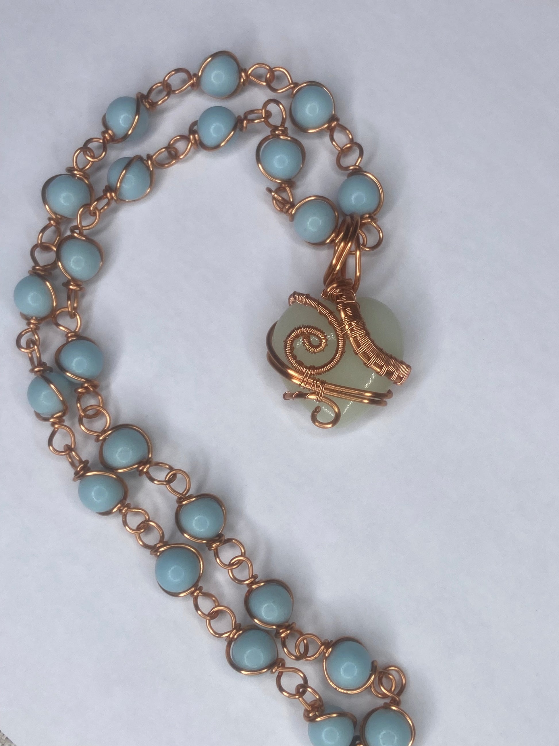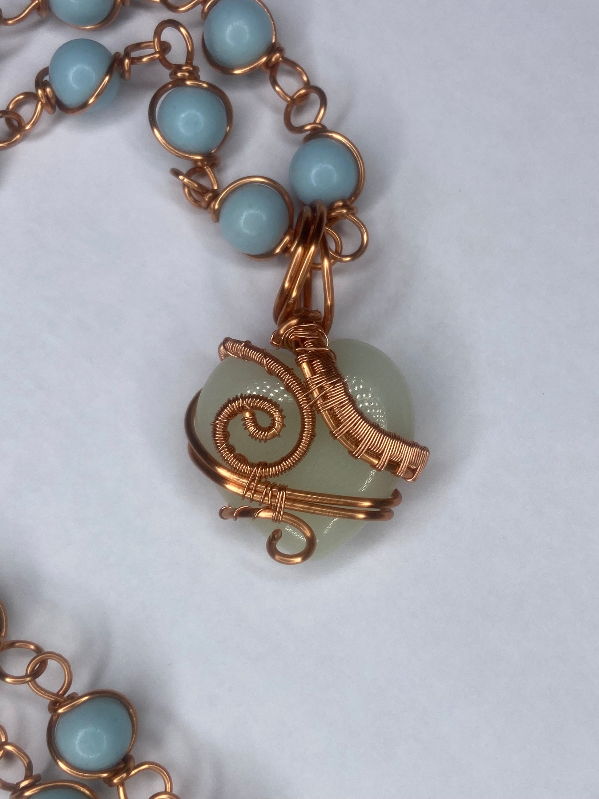 Imagine walking into a room wearing this unique necklace, brilliantly showcasing a phosphorus crystal encased in a delicate and intricate copper wrap. The contrast of the vibrant green phosphorus against the warm hue of the copper creates a mesmerizing visual feast for the eyes, instantly adding a touch of sophistication to any outfit.