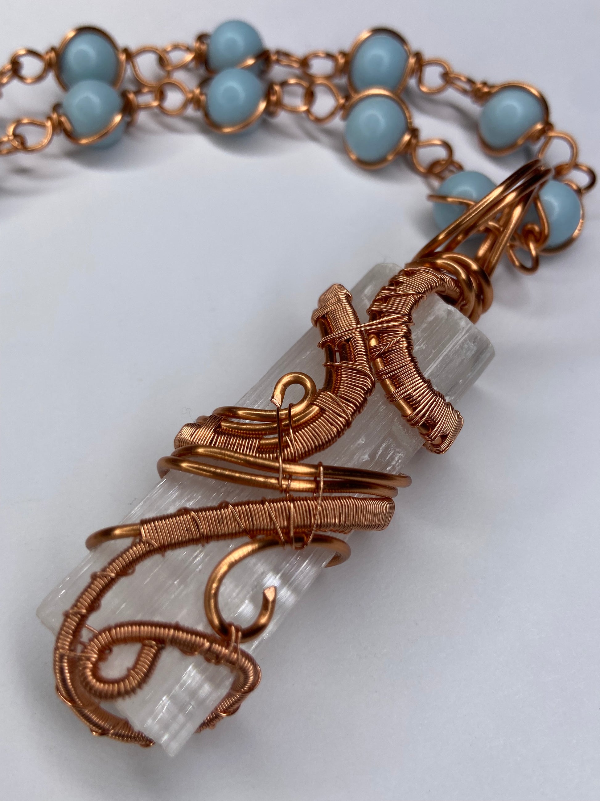Crafted with utmost care and attention to detail, this exquisite necklace seamlessly marries the gentle energies of Selenite and Angelite. Selenite, known as the "stone of the moon," exudes a serene and calming aura that helps alleviate anxiety and stress. Its pure white hue symbolizes purity and clarity, making it a perfect companion for those seeking spiritual growth and inner peace.