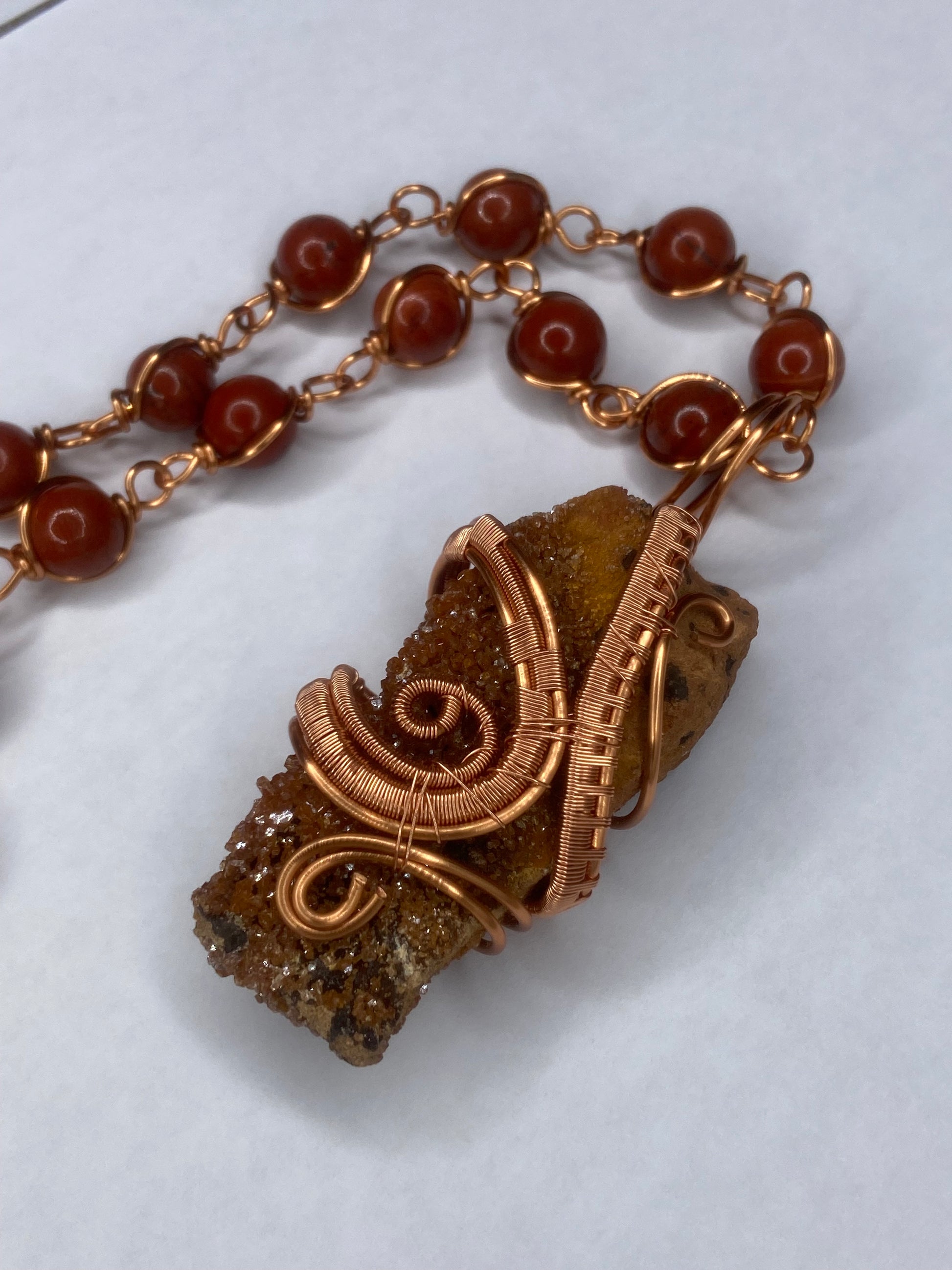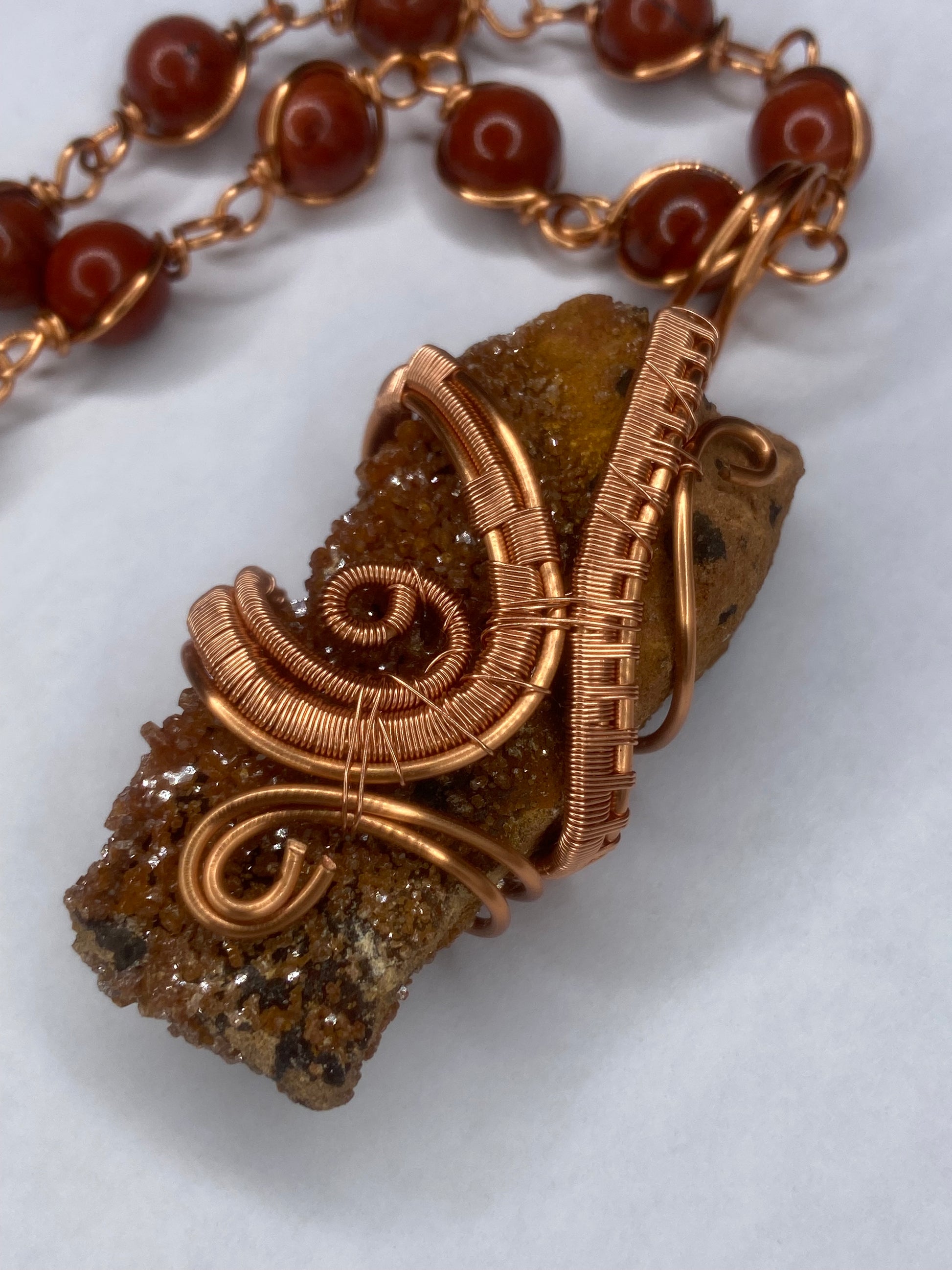 This exquisite Vanadinite and REd Jasper Reiki Infused Masterpiece Pendant combines the grounding and stabilizing properties of Vanadinite with the energizing and creative energies of REd Jasper. The Reiki infusion enhances the overall vibrational benefits of the pendant, promoting balance, clarity, and positive energy flow. Wear this pendant to enhance your sense of self-confidence, creativity, and overall well-being.