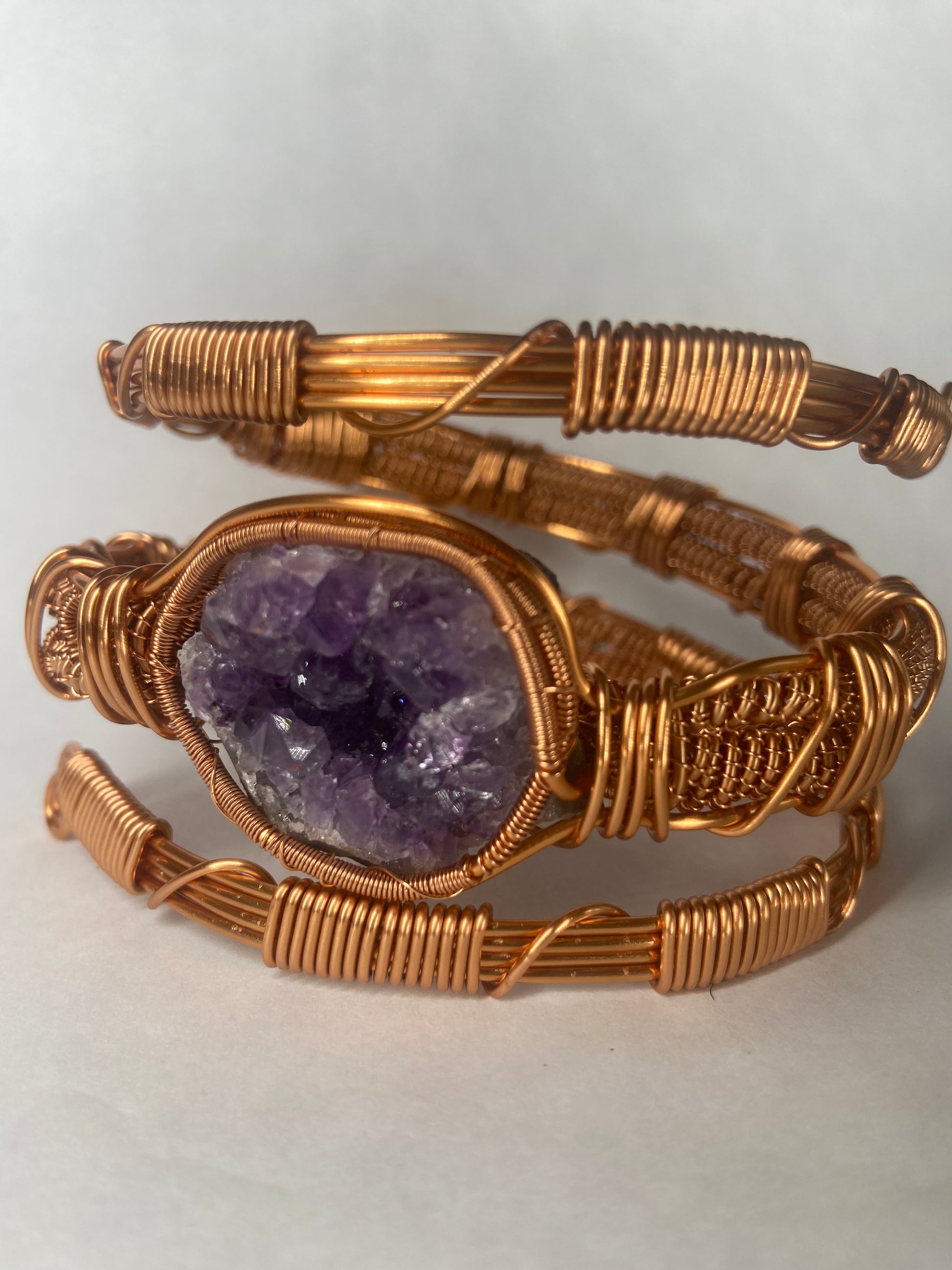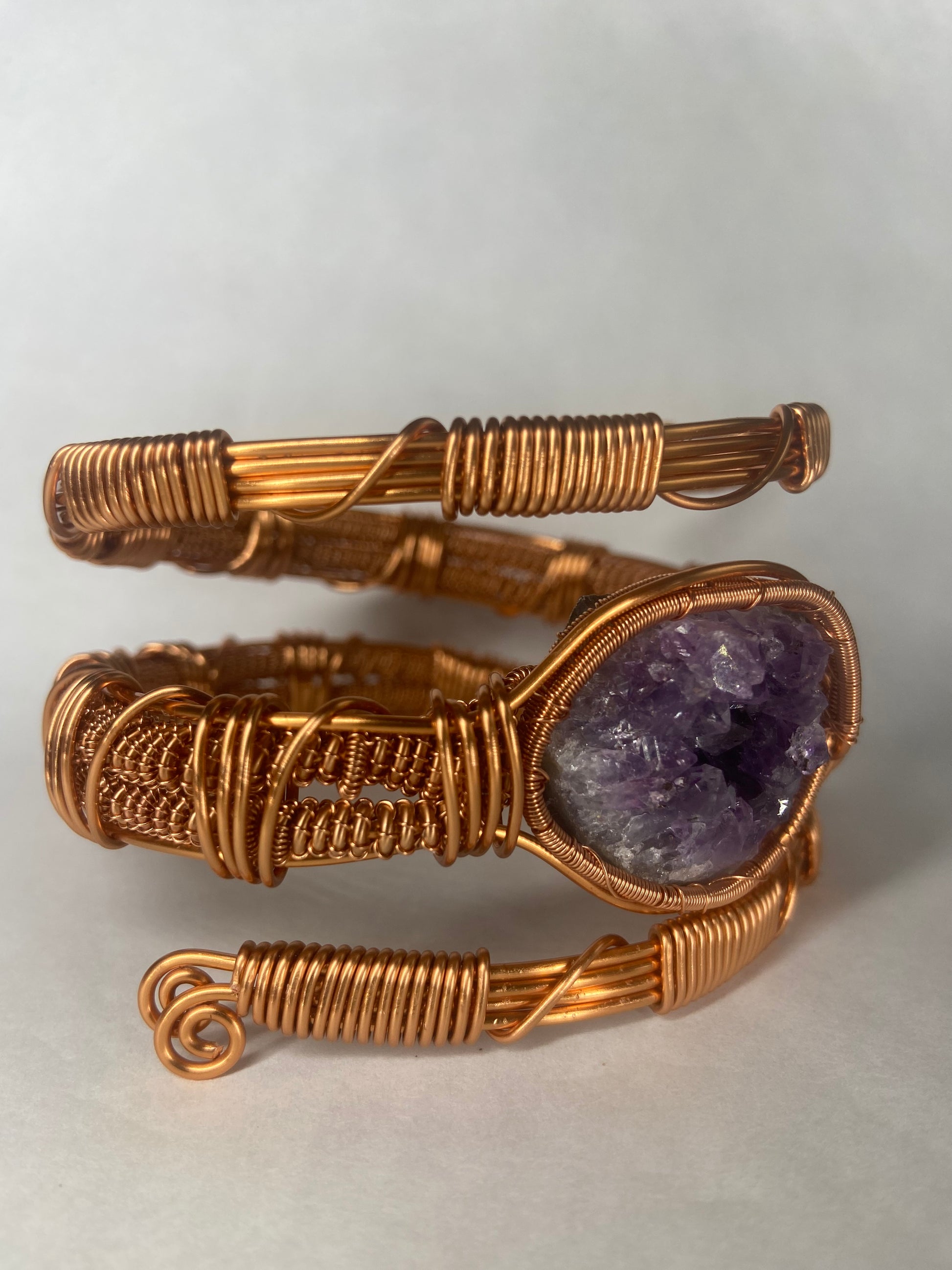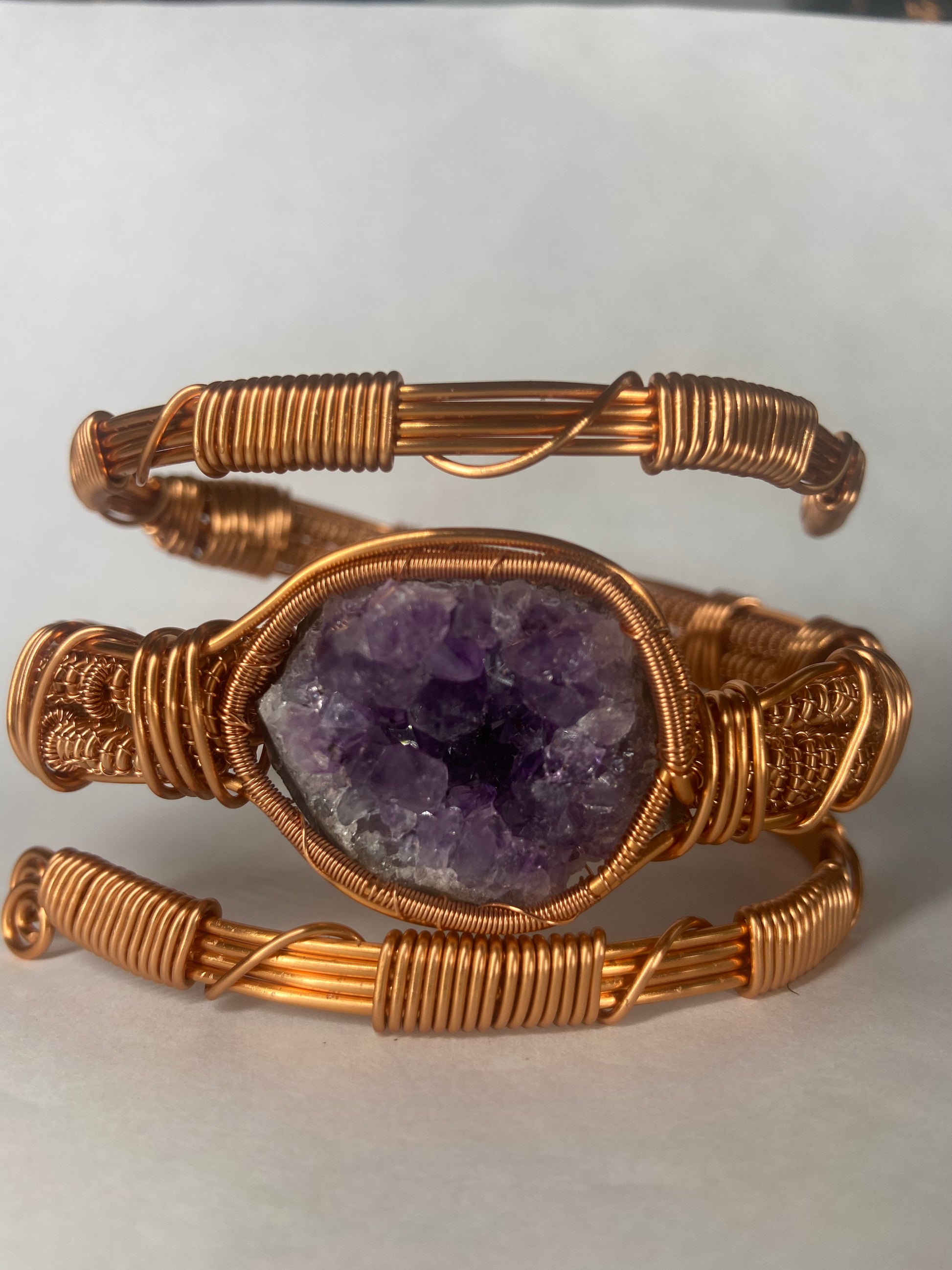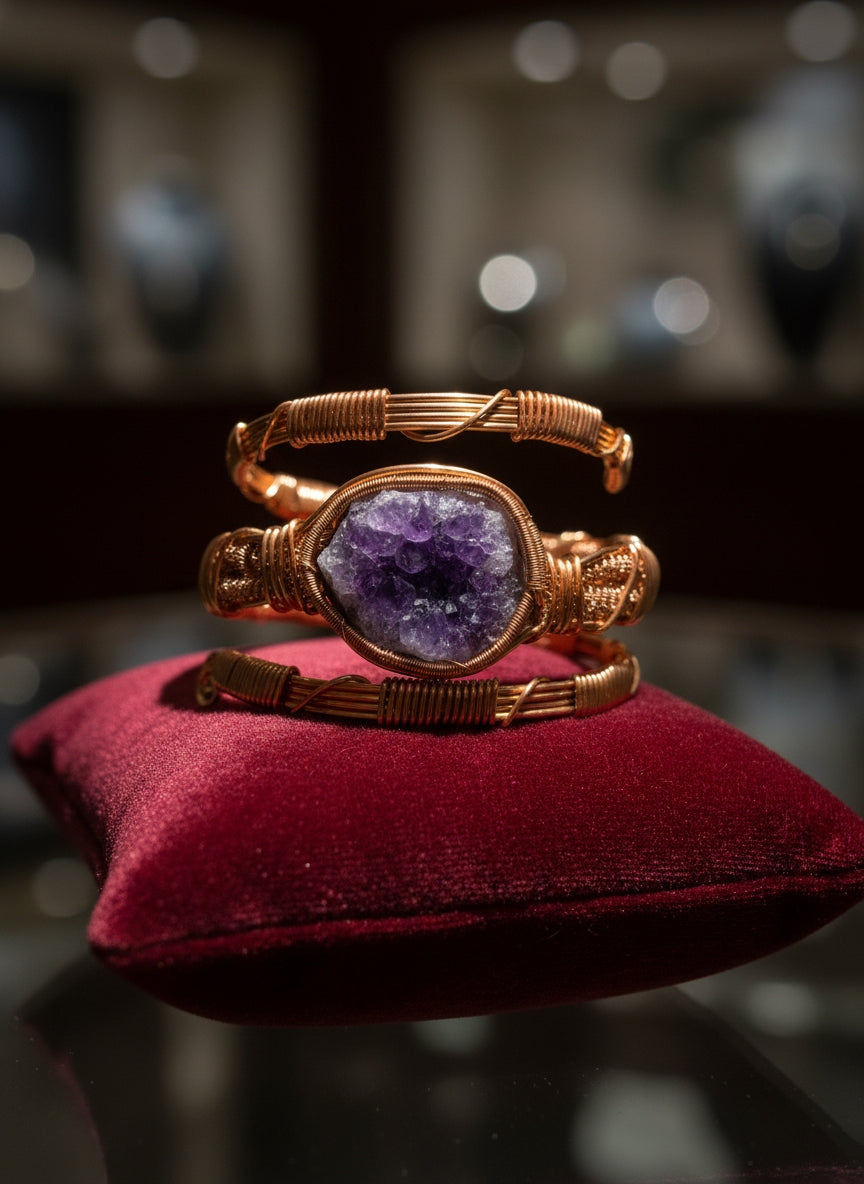 Bathed in the royal glow of deep violet, Amethyst Bracelet is a sanctuary you can wear—a calming force that clears the mind, lifts the spirit, and awakens your intuition. Hand-wrapped in radiant copper, the stone’s natural energy flows freely, releasing tension, quieting overthinking, and aligning you with your highest self. Imagine fastening it against your skin: the gentle weight grounding you, the cool smoothness soothing your heart, and a soft, empowering calm settling over your entire being. Each shimmer of purple is a reminder—you are safe, guided, and already more powerful than you realize.
